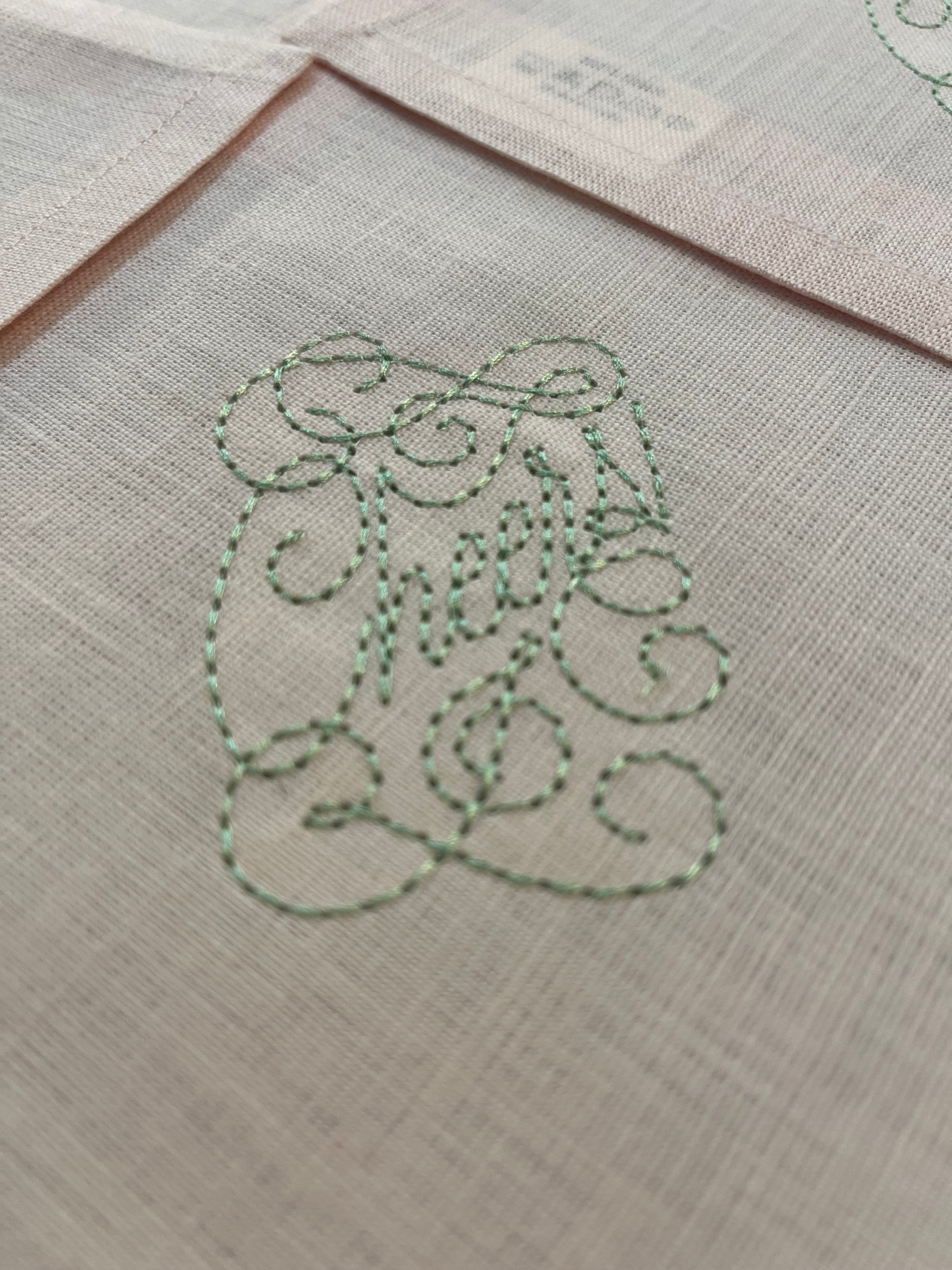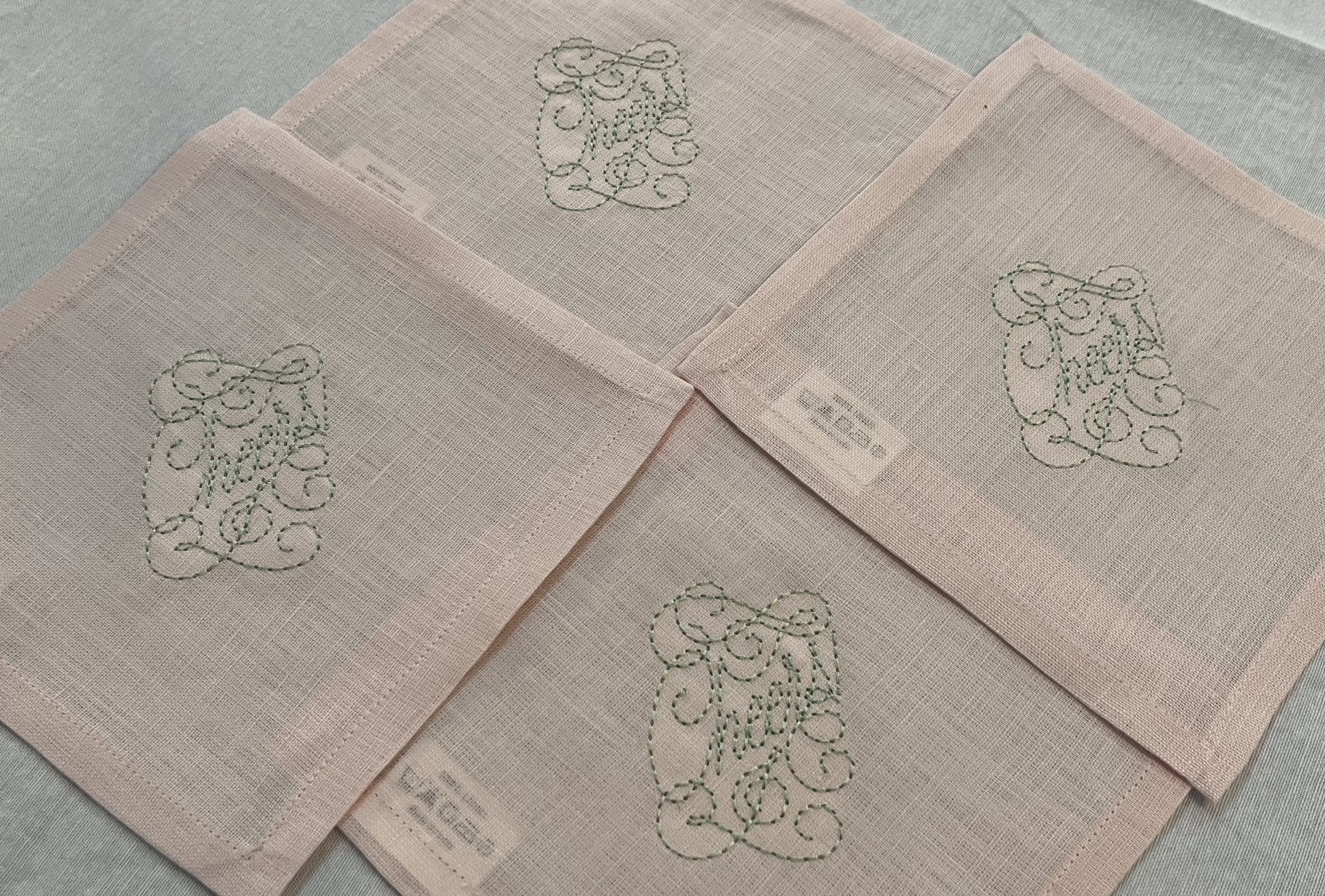 Just one set of these 4 cocktail napkins with the word "Cheers"! A great way to celebrate with friends or makes a beautiful gift. Pale pink linen napkins with a light green script.