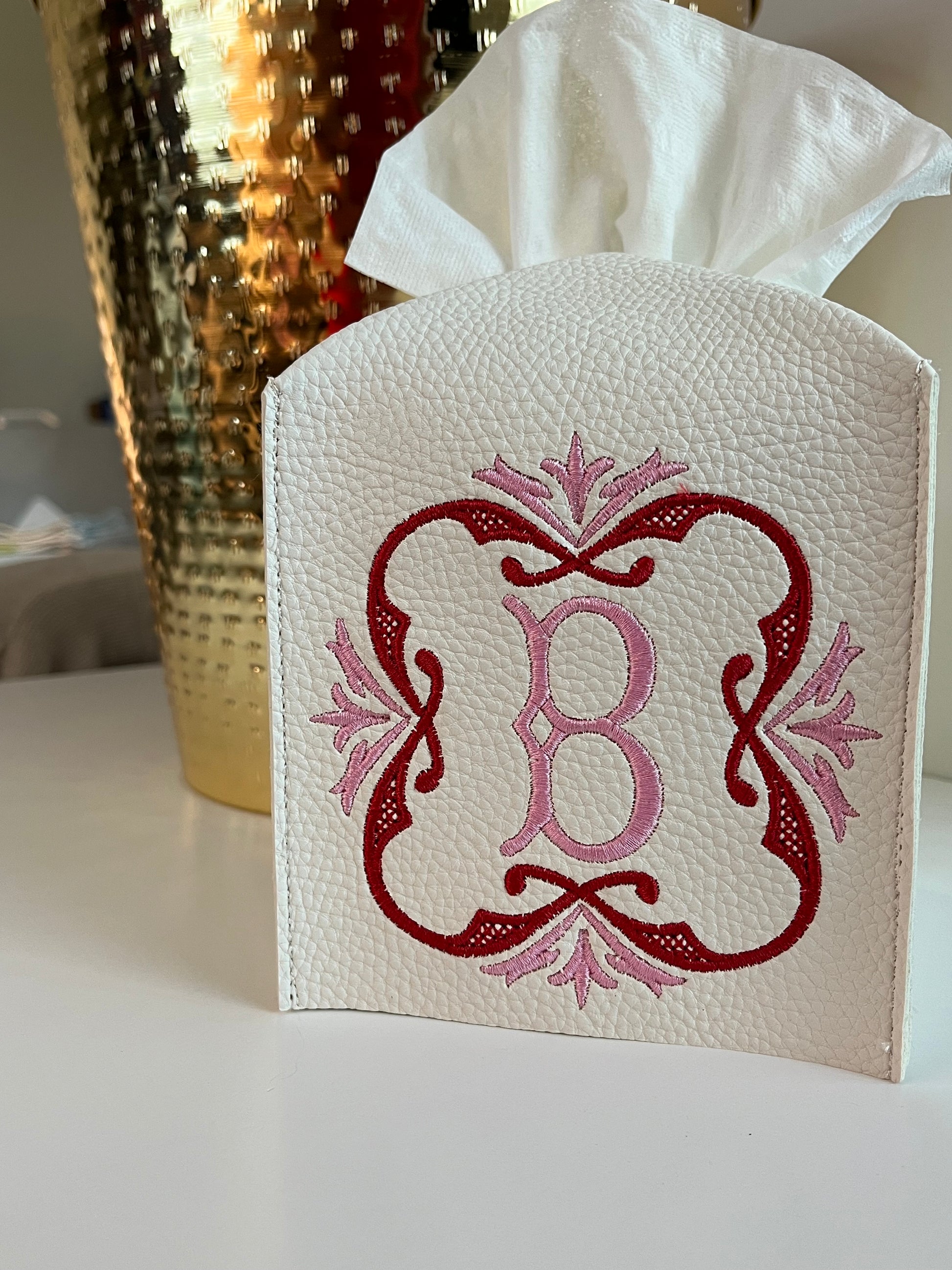Embroidered white leather tissue box cover. Made from PU leather with custom embroidery to make your bathroom counters, vanity, nightstands, nurseries, office desk, car more stylish! Dress up those square 5x5 tissue boxes with contemporary or classic designs or a custom monogram! You choose the color palette and initial!