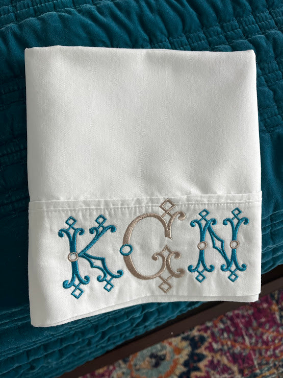 Elevate your bedding game with our Luxurious Pillowcases! With a set of 2 white 1000 thread count cases, featuring the Belclaire Font with your choice of colors, you'll add a touch of luxury to your bedroom. A perfect gift that will surely be treasured.