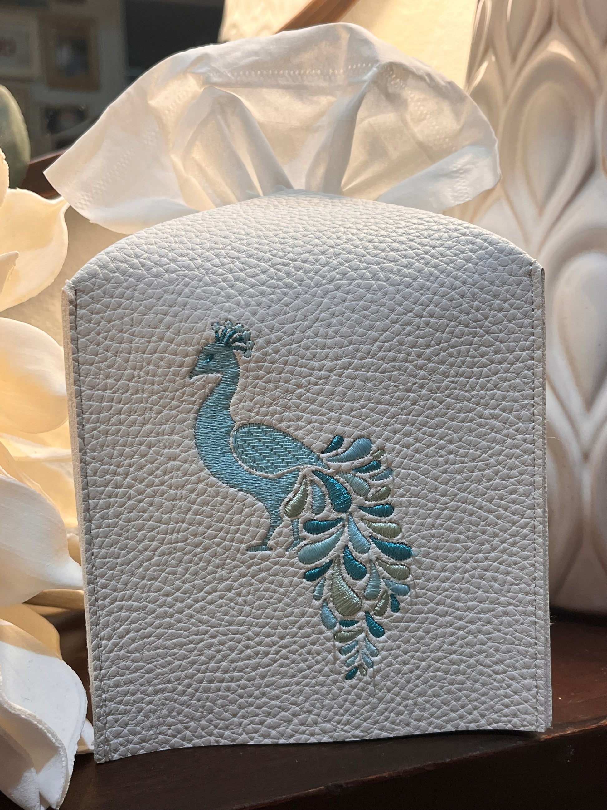 The pretty peacock tissue box cover is crafted from faux leather with vibrant shades of blue and green, it brings the playful elegance of a peacock’s feathers right to your room. Durable and easy to clean, this cover turns an everyday item into a charming accent that brightens any setting.