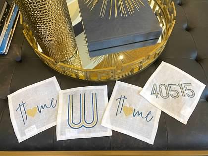 The perfect wedding or housewarming gift! Customize this set of 4 white hemstitch linen cocktail napkins with your zip code, last name initial and the word Home. Custom color palettes.