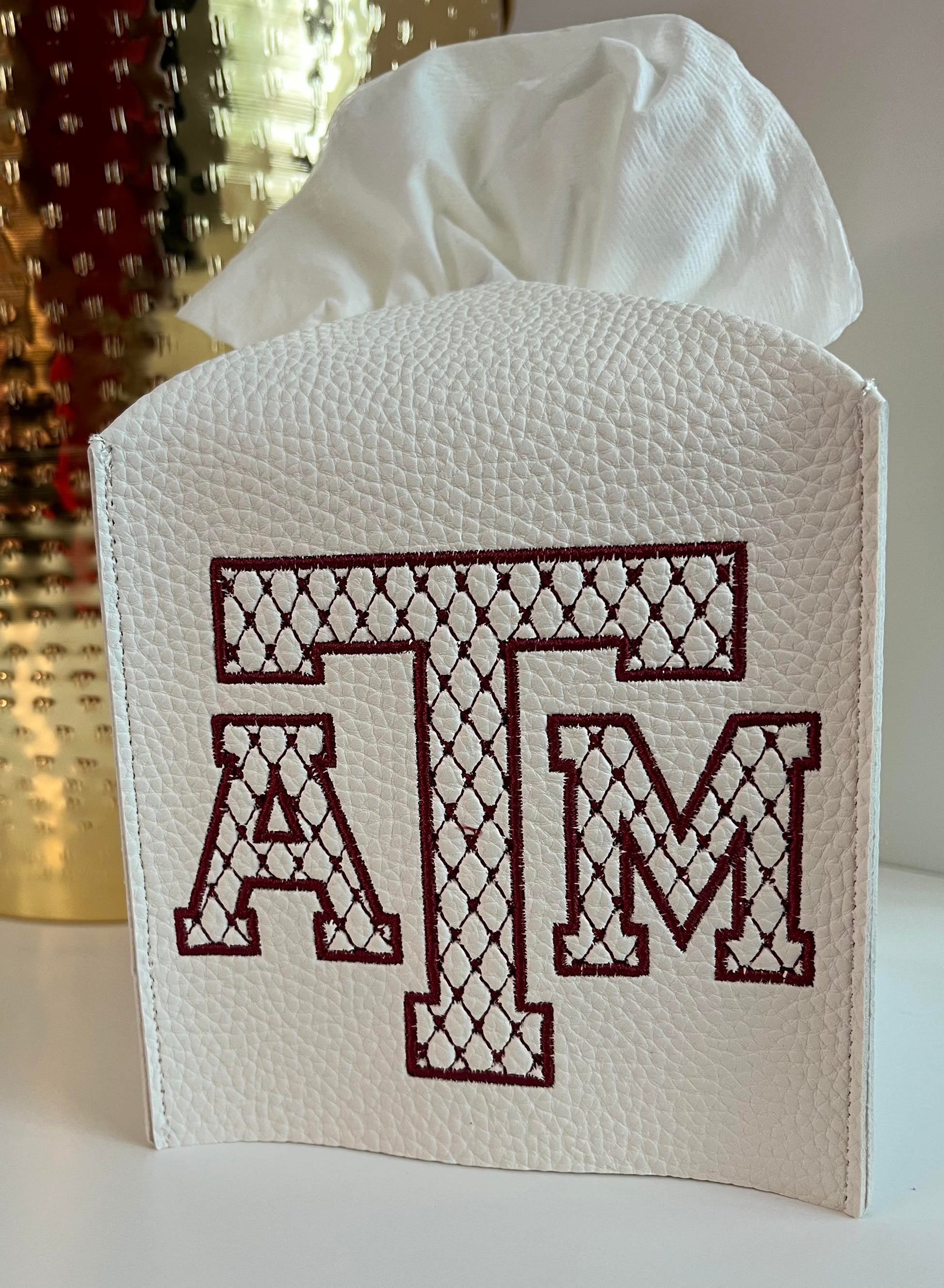Show your A&M pride with this chic embroidered leather tissue box cover!