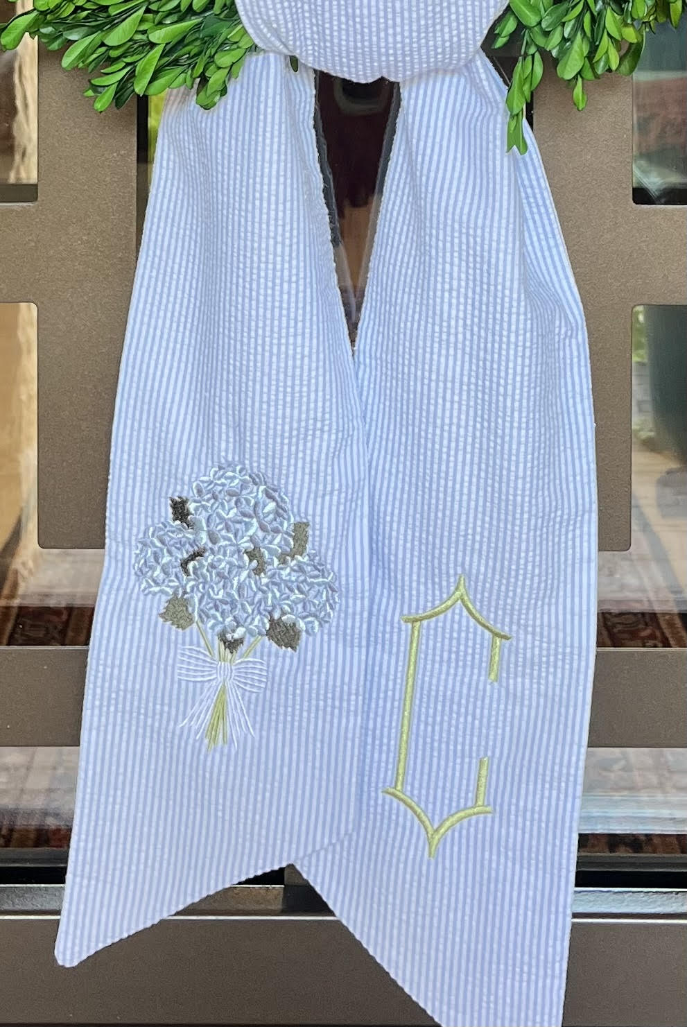Welcome guests to your home with our pretty blue and white seersucker wreath sash adorned with delicate hydrangeas and a customized chinoiserie initial.
